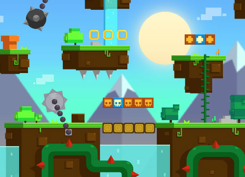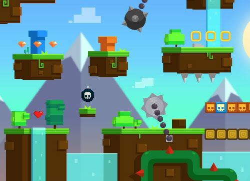 A retro, block style mountainous terrain with complete with pipes, swinging spiked balls, waterfalls, climbable vines, pick-ups and more!