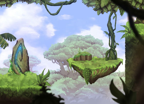 A fun vector-illustrated side scroller forest set drawing originally in Adobe Illustrator and exported to tiled PNG files along with other separated elements.